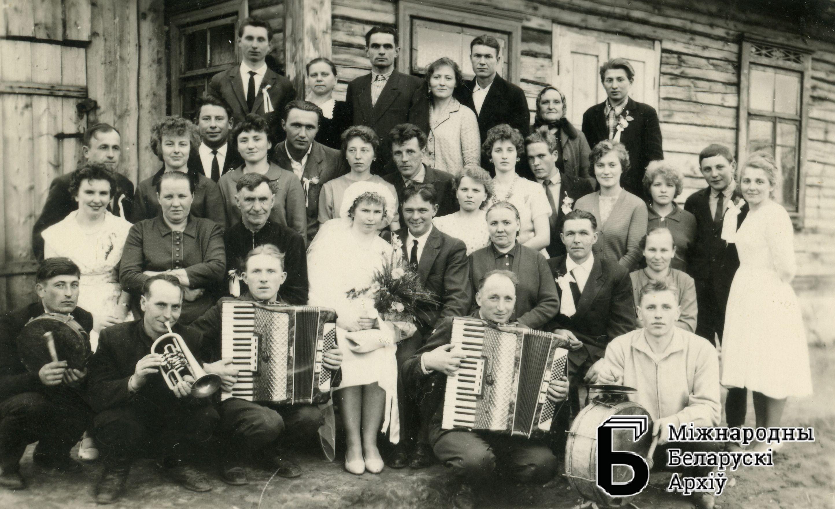 Wesele w Nalibokach. Młoda para, goście i zespół muzyczny. Osoby nieznane
