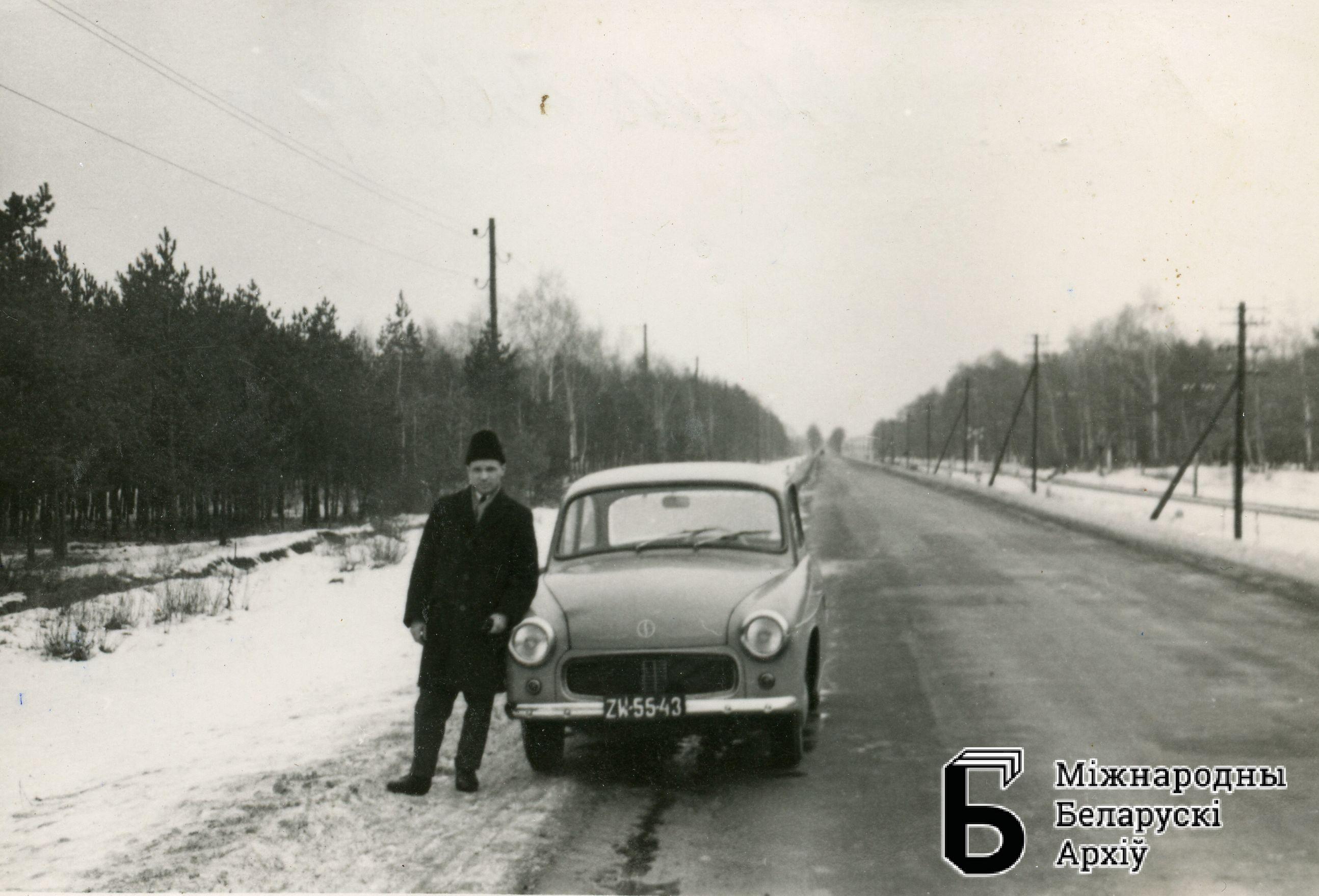 Mężczyzna zimą przy samochodzie "Syrena". Osoba nieznana