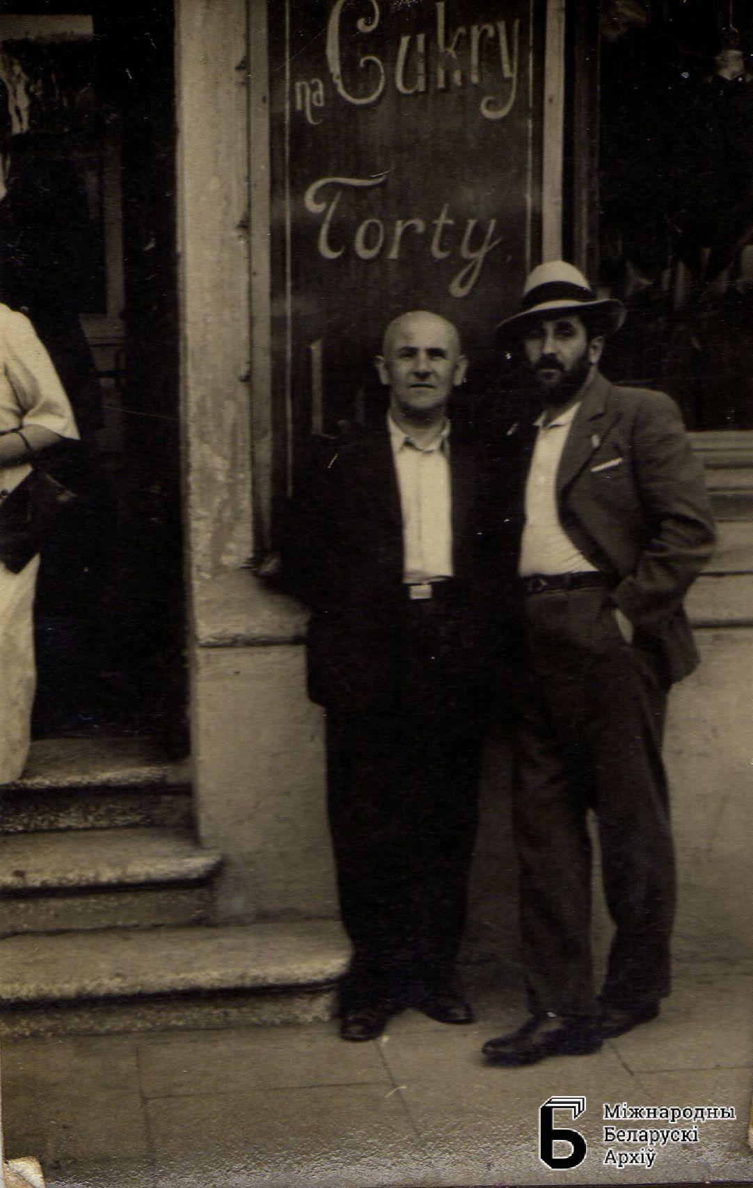 | brak autora, 1930-1939, Izaak Kapica ze znajomym przy cukierni w Grodnie | 27 gru 2014 |