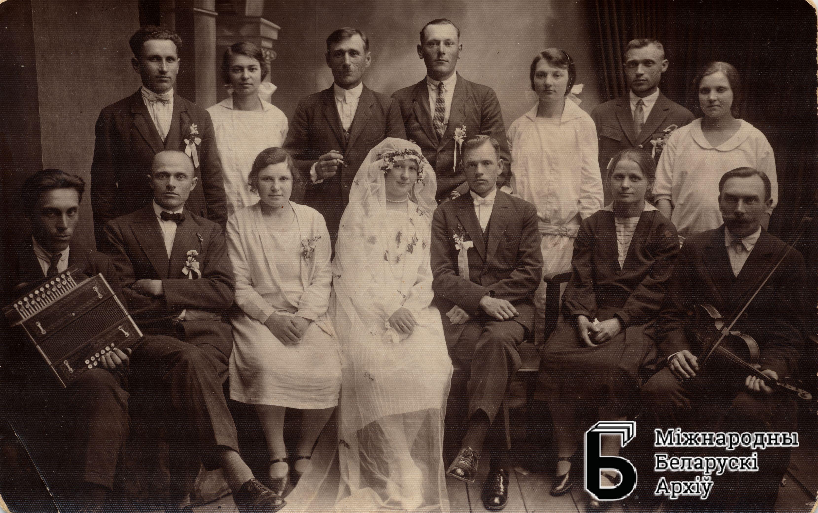Wesele w Grodnie. Młoda para, goście i zespół muzyczny. Osoby nieznane