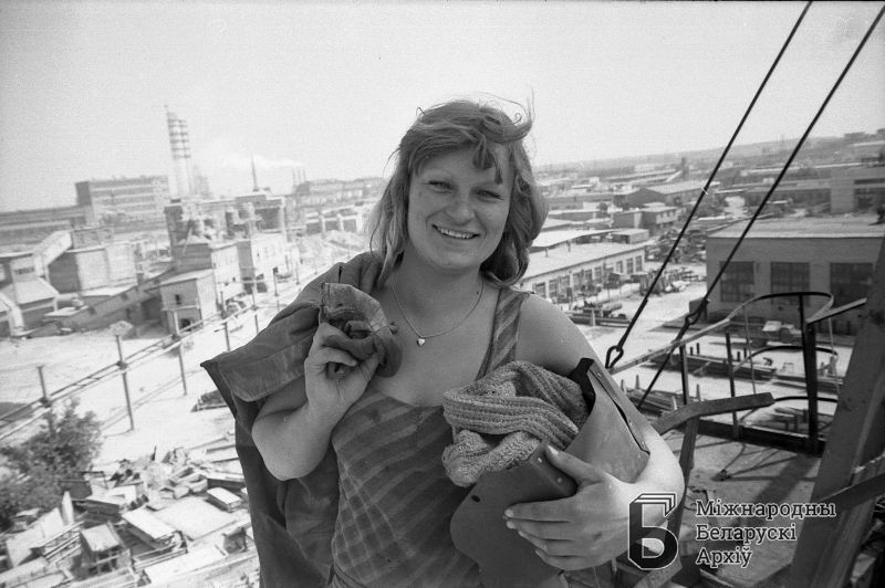 Grodno. Robotnica kombinatu budowlanego "Grodnаprambud" na budowie w zakładzie AZOT