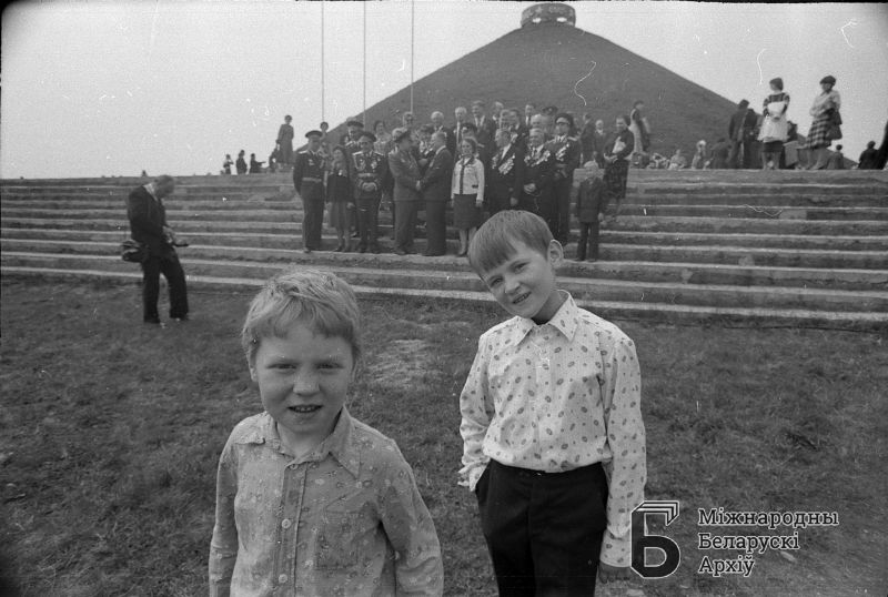 Dwóch chłopców na tle świętujących Dzień Zwycięstwa 9 maja
