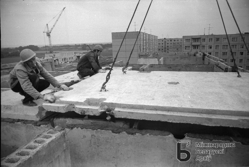 Grodno. Budowlańcy na placu budowy, ul. Repina