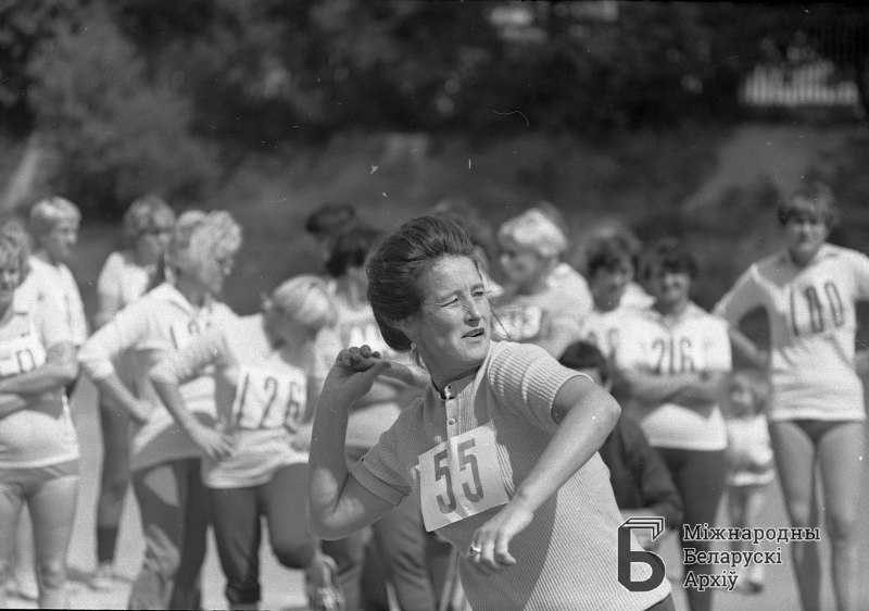 Grodno. Kobieta bierze udział w zawodach sportowych. Stadion "Czerwony sztandar"