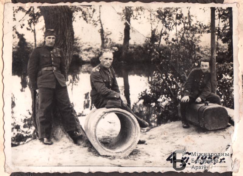Trzech mężczyzn w mundurach armii polskiej na brzegu rzeki. Tadeusz Czesław Kwapisiewicz i in.