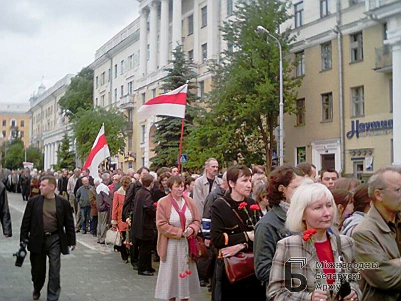 Pogrzeb Wasila Bykawa, Mińsk 25.06.2003. Ludzie na ulicy z flagami