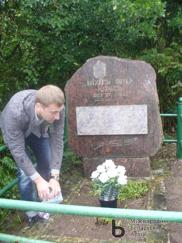 Title: Акцыя памяці паэта Міхася Явара ў Мастоўскім раёне 25.08.2012. Васіль Клімовіч ускладае кветкі да магілы Міхася Явара ў Падбаранах