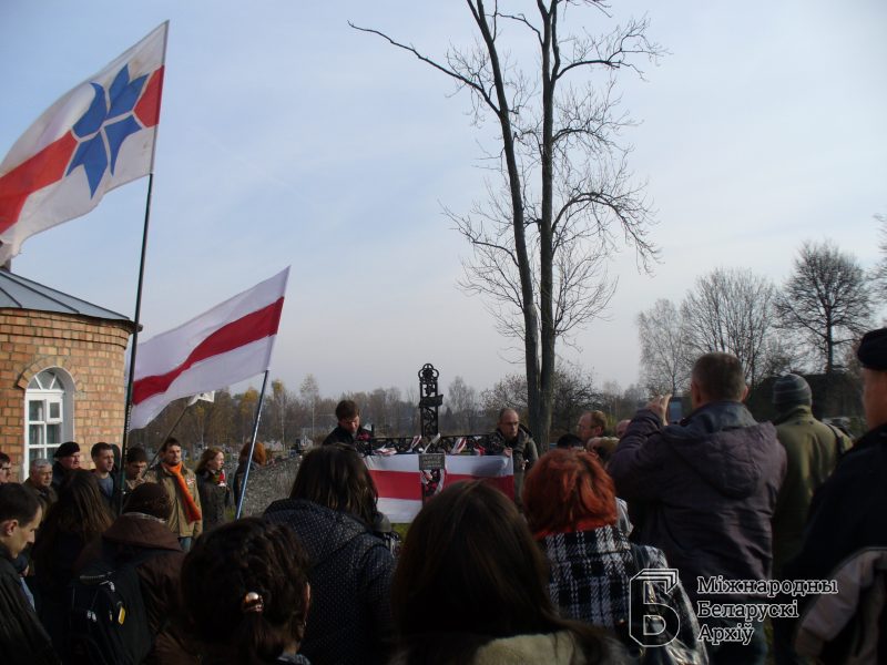 Akcja pamięci poświęcona powstańcom 1863 roku. Świsłocz 30.10.2010. Uczestnicy obok krzyża z flagami