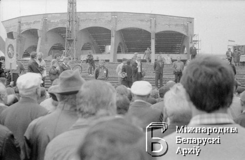 Wybory do Rady Najwyższej i rad lokalnych Białoruskiej SRR. Wiec wyborczy BNF na stadionie "Traktor" w Mińsku w maju 1990 r.