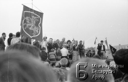 Wybory do Rady Najwyższej Białoruskiej SSR i rad lokalnych. Wiec wyborczy BNF w pobliżu Pałacu Kultury "Sukno" w Mińsku w maju 1990 r.