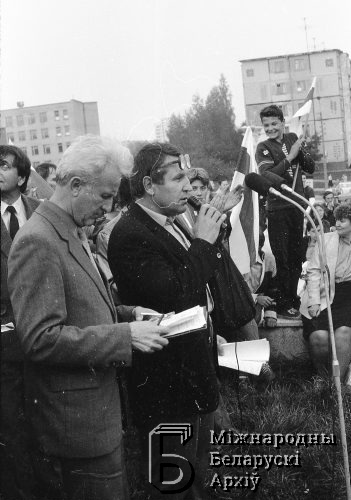 Wybory do Rady Najwyższej Białoruskiej SSR i rad lokalnych. Wiec wyborczy BNF w pobliżu Pałacu Kultury "Sukno", prowadzony przez członka Sejmu BNF Hienadzja Bankievicha