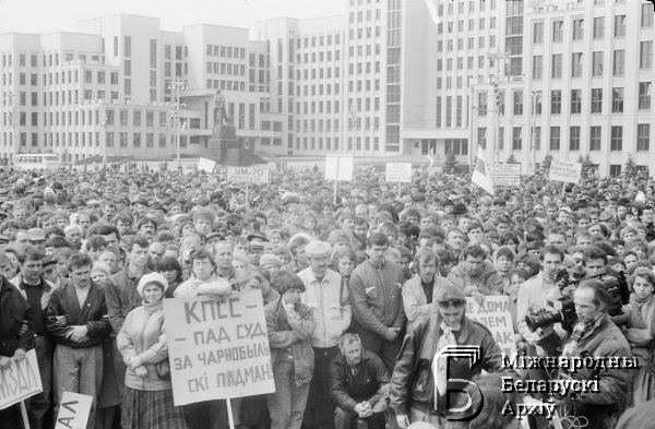Мітынг бастуючых рабочых на плошчы Леніна (цяпер Незалежнасці), арганізаваны незалежнымі прафсаюзам