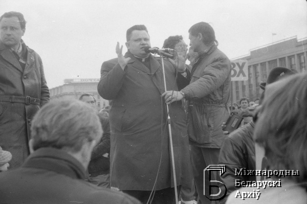 Мітынг бастуючых рабочых на плошчы Леніна (цяпер Незалежнасці), арганізаваны незалежнымі прафсаюзам