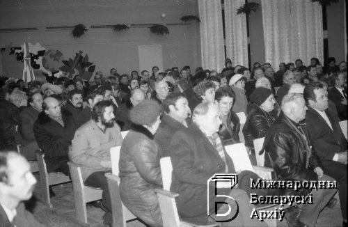 Wybory do Rady Najwyższej Białoruskiej SSR i rad lokalnych. Spotkanie lidera BNF Zianona Pazniaka z wyborcami w szkole w dzielnicy Partyzanckiej Mińska w lutym 1990 r.