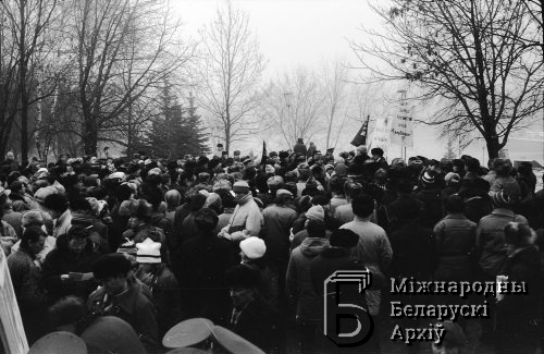 Wybory do Rady Najwyższej Białoruskiej SRR i rad lokalnych. Wiec wyborczy BNF w pobliżu sztabu Białoruskiego Okręgu Wojskowego w Mińsku w marcu 1990 r.