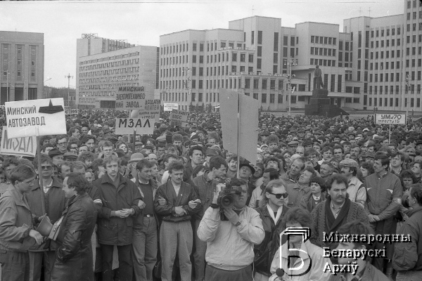 Мітынг страйкуючых рабочых мінскіх заводаў на плошчы Леніна (Незалежнасці)