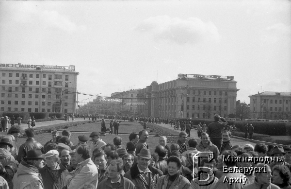 Wiec robotników strajkujących zakładów mińskich na placu Lenina (Niepodległości)
