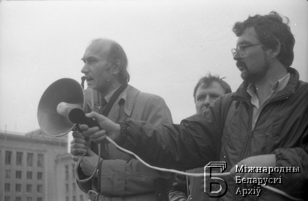 | Wiec robotników strajkujących zakładów mińskich na placu Lenina (Niepodległości). Zianon Pazniak, Henadź Bykau | Dec 30, 2015 |