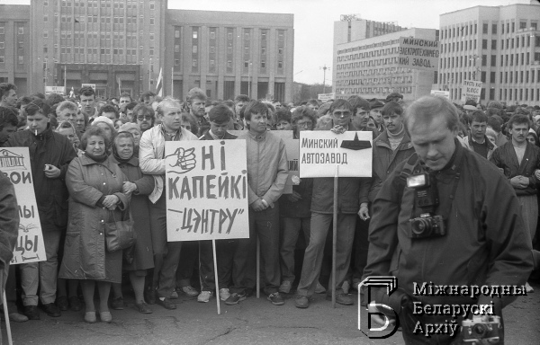 Wiec robotników strajkujących zakładów mińskich na placu Lenina (Niepodległości)