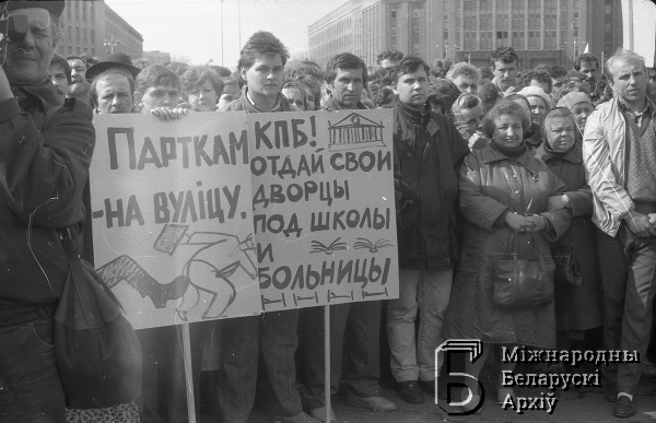 Wiec robotników strajkujących zakładów mińskich na placu Lenina (Niepodległości)