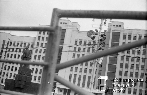 Wiec robotników strajkujących zakładów mińskich na placu Lenina (Niepodległości). Dom Rządu
