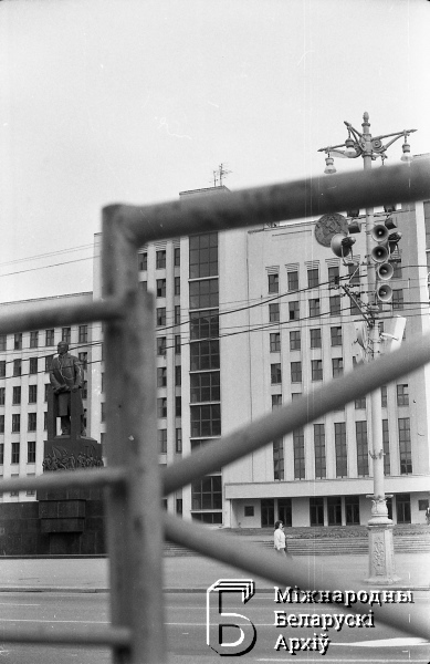 Wiec robotników strajkujących zakładów mińskich na placu Lenina (Niepodległości). Dom Rządu