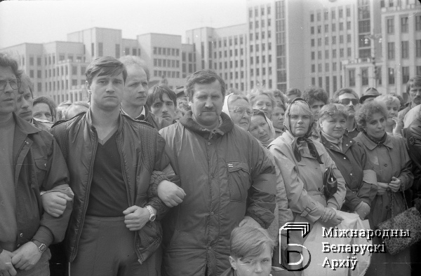Wiec robotników strajkujących zakładów mińskich na placu Lenina (Niepodległości)