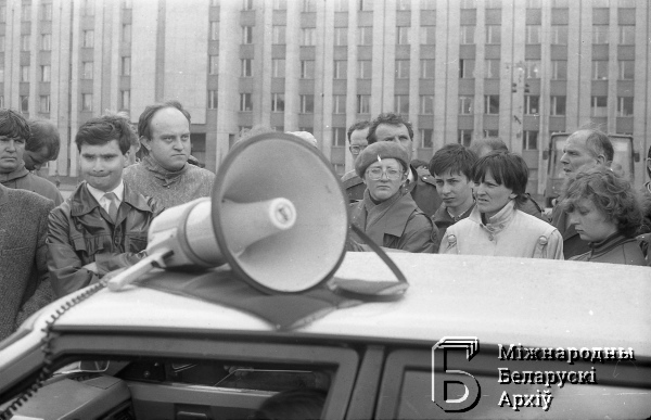 Wiec robotników strajkujących zakładów mińskich na placu Lenina (Niepodległości)