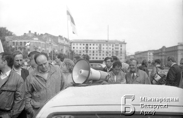 | Wiec robotników strajkujących zakładów mińskich na placu Lenina (Niepodległości). Działacz Mikoła Sasnouski | Jan 4, 2016 |