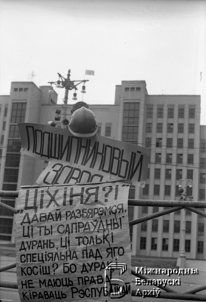 Protesty strajkujących robotników na placu Lenina (Niepodległości). Transparent z hasłami przeciwko posłowi Valeryjowi Cichinjowi