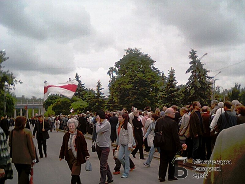 | Hilmanowicz, Uładzimir, 2003-06-25, Pogrzeb Wasila Bykawa, Mińsk 25.06.2003. Ludzie na ulicy, mężczyzna z flagą | Apr 7, 2015 |