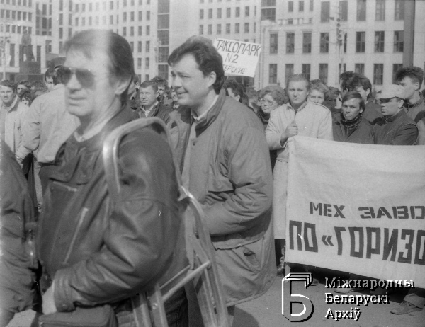 Мітынг бастуючых рабочых на плошчы Леніна (цяпер Незалежнасці), арганізаваны незалежнымі прафсаюзам
