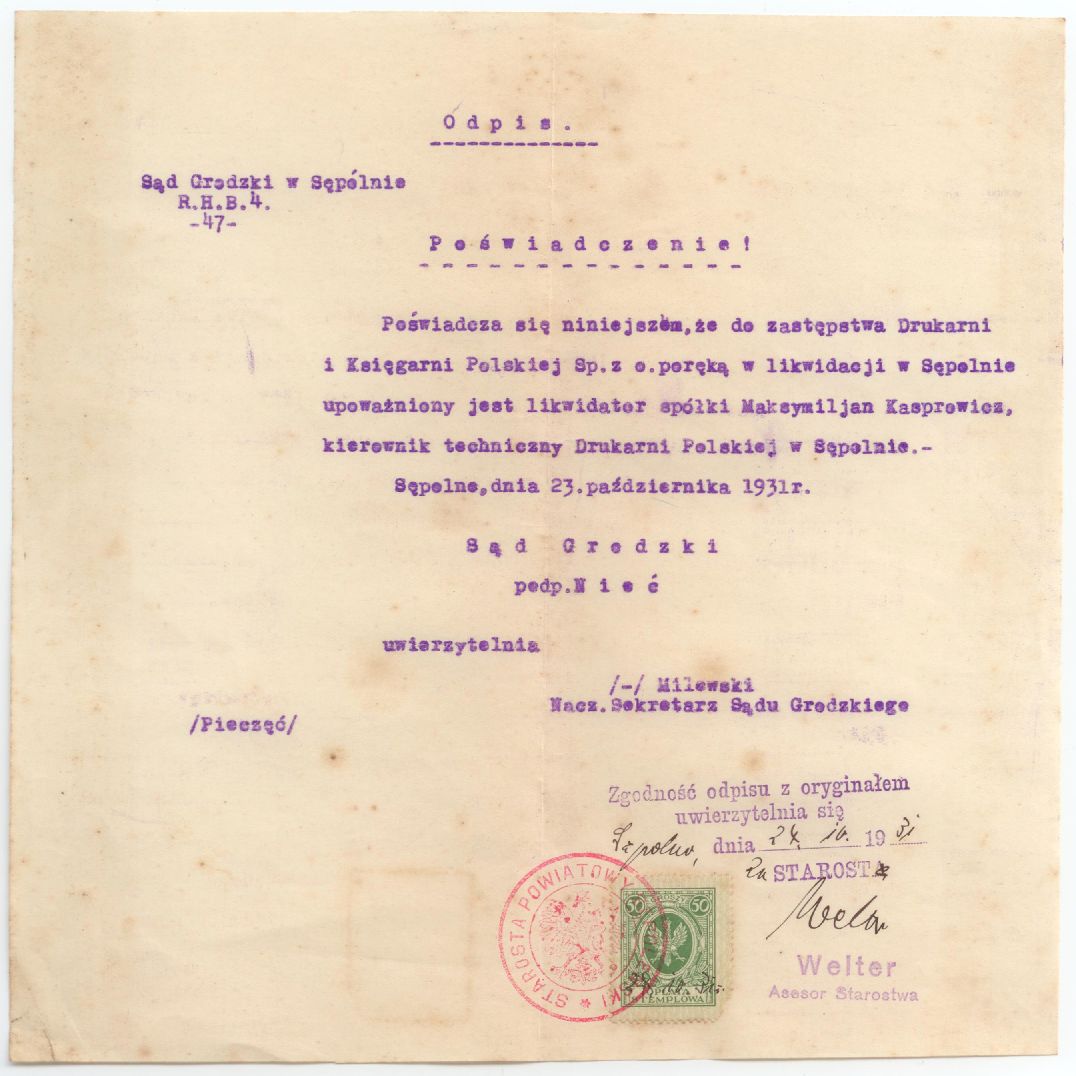 Title: Odpis poświadczenia upoważnienia do likwidacji spółki Drukarni i Księgarni Polskiej Sp. z o. poręką