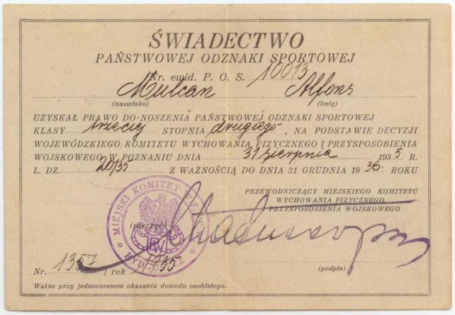 Rok 1935. Świadectwo Państwowej Odznaki Sportowej