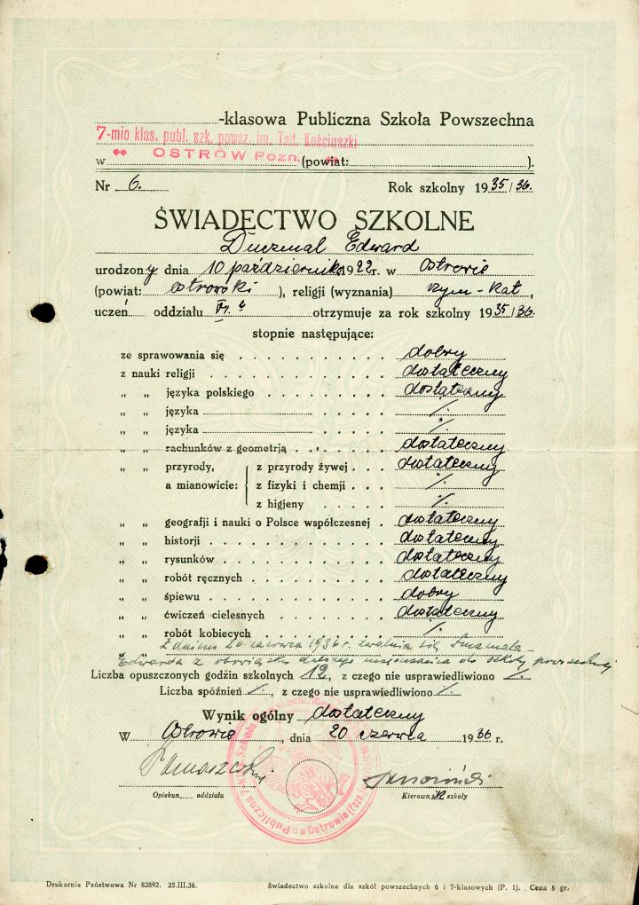 świadectwo ; szkoła powszechna ; Ostrów Wlkp.