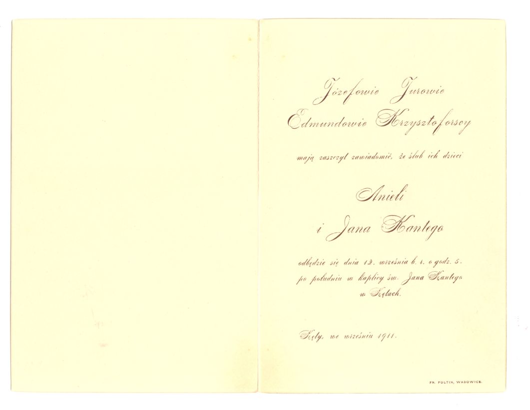 1911. Zaproszenie na ślub Anieli Jury i Jana Kantego Krzysztoforskiego