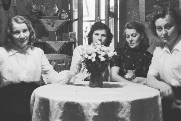 Polki po zwolnieniu z łagru, siedzą od lewej: Barbara Dudycz, Tamara Ochromienko, Bronisława Kutiuk (z kotem), Anna Szyszko.