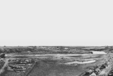 Tytuł: Fragment panoramy Workuty. Z prawej nad rzeką widać elektrownię (TEC-1), która zaopatrywała w elektryczność cały obszar. Po prawej na dole widoczne są baraki obozu przy kopalni nr 9-10, liczącej w tamtym czasie ponad 10 tysięcy więźniów. Z lewej fragment jedynego mostu kolejowego z torami prowadzącymi do obozu przy kopalni nr 8 "Rudnik". Obok mostu stoją baraki dla półwolnych.