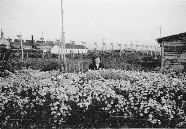 Anna Szyszko w tundrze przed ogrodzeniem łagru, w tle baraki obozu cegielni nr 2.