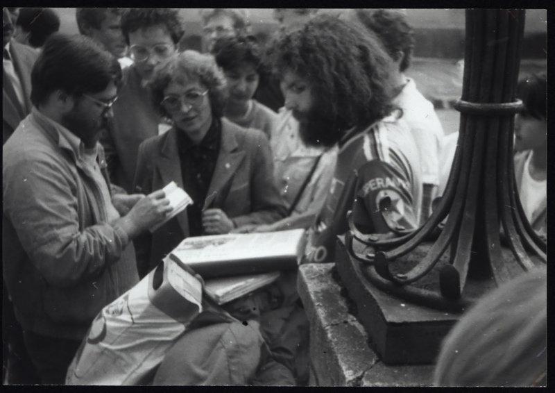 Spotkanie z francuskim rowerzystą - Jorgusem z okazji 100-lecia języka esperanto, Rynek Kościuszki, Białystok, 3 sierpień 1987 r.