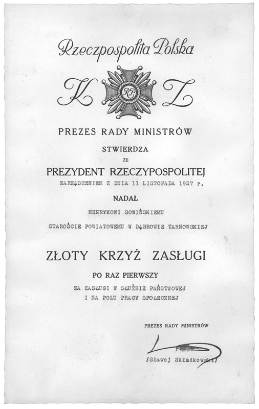 Dyplom nadania Henrykowi Sowińskiemu Złotego Krzyża Zasługi, za osiągnięcia w służbie Państwu i na polu pracy społecznej, 11 listopada 1937 r.