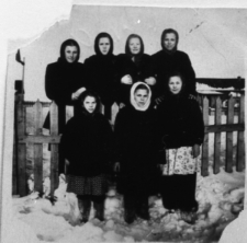 | Siedem kobiet (dziewczynek?) w zimowych strojach i chustkach, stoją przy drewnianym płocie. | Oct 28, 2013 |