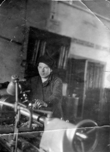 Title: Wiktor Muśnikowicz z Brześcia podczas pracy w kuźni jako więzień 11 łagpunktu w Krasłagu, ZSRR. Na odwrocie dedykacja: "Na wieczną pamiątkę ofiarowuję swą podobiznę koledze Tadziowi nie zapominaj o naszej niewoli Wiktor M.".