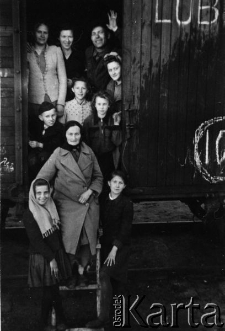 Title: Zofia Stanisławska (na stopniach wagonu, obok niej dwoje dzieci NN) z córką Ireną (w drzwiach wagonu z prawej, w chustce na głowie) i Kirdziakową podczas powrotu do kraju, wysiadają z wagonu na którym widnieje napis "Lub...".